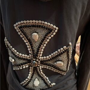 Chic gray hoodie with silver embellishments and striking cross rhinestone