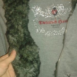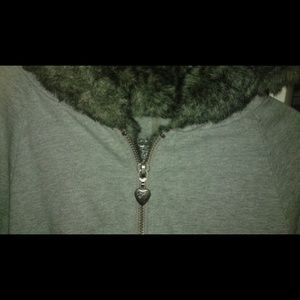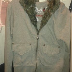 BRAND NEW!! Gray hooded sweatshirt with a pair of extremely sparkly silver angel wings on the back. The wings are sequined with rhinestone. The hood is lined in a super thick fluffy faux fur. This sweatshirt is super warm! No tags but it is in PERFECT condition...never been worn!
