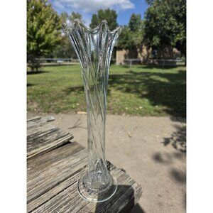 Pretty clear crystal vase ribbed/twisted pattern. Top is reminiscent of a swung vase with 8 points. Stand about 13 inches tall.