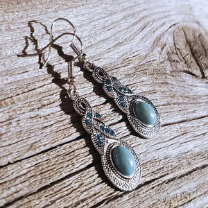 MATERIAL: silver plated alloy and brass metal, simulated / faux turquoise gem cabochons, Czech crystal rhinestones