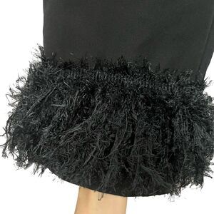 Straight leg faux feather hem pants. Nice tailored fit. Side zip closure. Furry stringy hem meant to resemble feathers, but it’s not using actual feathers. So chic and glam!