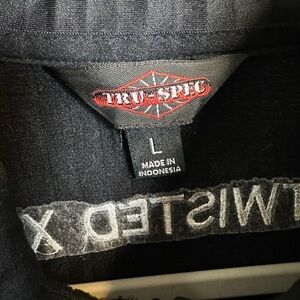 chest flat 25.5", length 30", sleeve measured under arm 24", thumbholes, zipper pocket on both sides, Tru Spec brand, embroidered with Twisted X, really great used condition