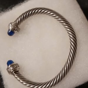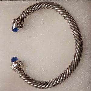 Twisted cable cuff sterling bracelet with blue sapphire gems & pave cz