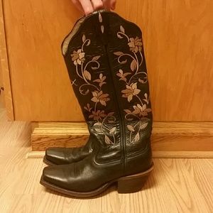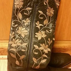 Black leather, with beautiful tan embroidery. Square toe.