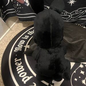 Unique black and gray plush bunny with three eyes and yellow accents. Features a mystical design.