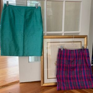 Two 100% silk designer skirts. Designer unknown. From a boutique while on vacation. Gorgeous vibrant colors. One turquoise and the other brilliant share of pink, blue and teal. Dry clean only. Rarely worn if ever.