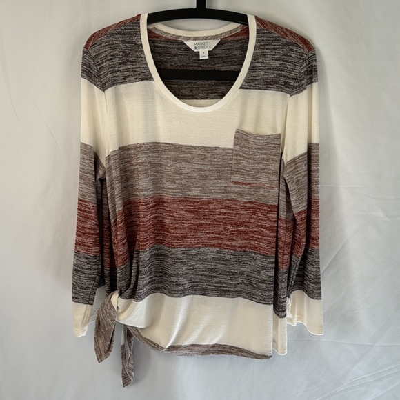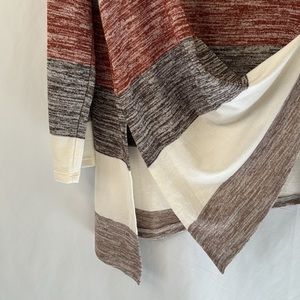 Market & Spruce color block light weight sweaters. Both are identical in cut- just different colors. One gently worn and one never worn. Have accent pocket on front with bottom split on right side that can be tied or worn untied. Material is 48% rayon, 48% polyester and 4% spandex. Arm pit to arm pit is 22 inches.