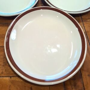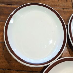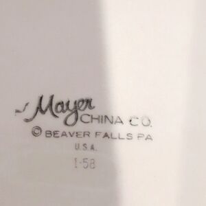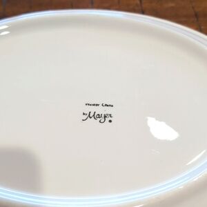 White with solid brown Trim. Bottom stamped Mayer China Co. Each Oval plate measures approximately 11.25" X 9.25".
