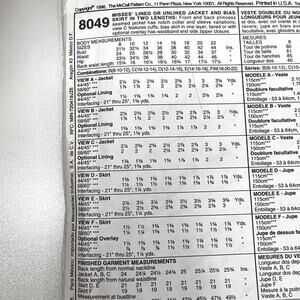 Set of two vintage 1990s McCall's petite-able sewing patterns to make two piece skirt or pant and jacket suit outfits. McCall's 8049 size B 8,10,12line dor unlined jacket and bias skirt in two lengths and McCall's 8750 Size B 8,10,12 lined jacket, top, pants, and skirt. All patterns are uncut. Please see photos for more detailed measurements and description! Bundle and save!