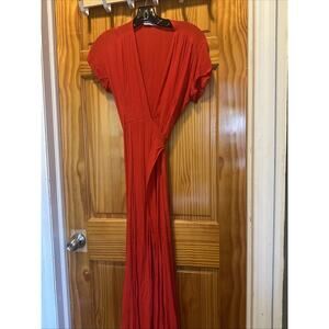 The Two Arrows revolve Felix Midi Wrap Dress in red, size Large, is a stylish and versatile piece for casual occasions during the warmer seasons. Made from breathable rayon fabric, this short-sleeve dress features a flattering midi length and a wrap design that adds a trendy touch. Perfect for summer, fall, or spring, this dress from the Two Arrows brand is a must-have addition to any woman's wardrobe.