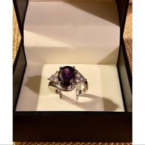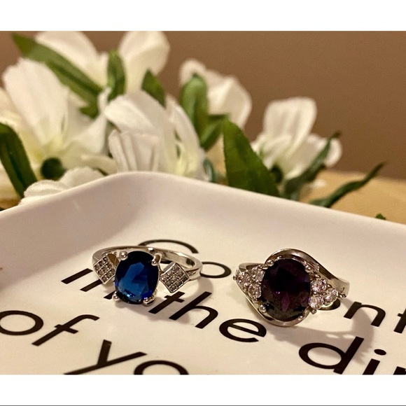 -First ring is a deep purple with hints of dark blue in the sunlight with surrounding diamonds (CZ) and sterling silver