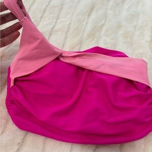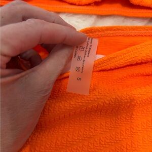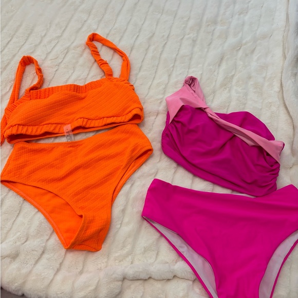 Bright orange bikini top and bottom with a textured design. Includes a pink bikini set