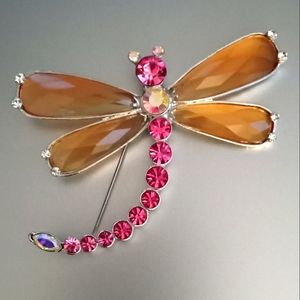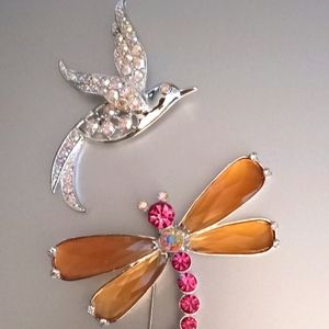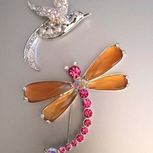 A silver rhinestones dragonfly and a pink lt.bronze wings The hummingbird. Each are costume jewelry. perfect for pinning on your lapel or hat.