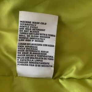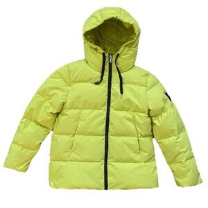 This vibrant neon yellow puffer jacket from Two By Vince Camuto is in excellent, like-new condition. It features a cozy hood, zipper pockets, bottom drawstring, logo patch and a comfortable fill of 60% duck down and 40% feather, making it perfect for colder weather.