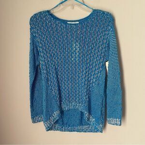 Blue and white color. Knit. Asymmetrical hemline. Long sleeve.