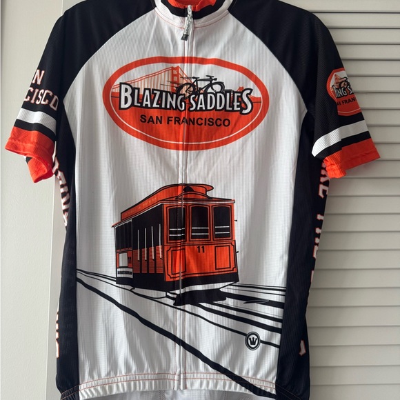 Jersey 1: Blazing Saddles San Francisco cycling jersey. Features a cable car design, size Large.