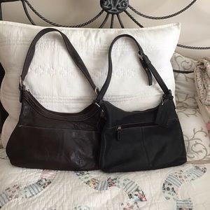 Two leather Charter Club handbags one black one brown. Each have one inside zip pocket and two slip pockets. The brown bag also has slips for ID and credit cards. The black is in almost perfect condition, the brown is in nice condition with scuffs on the bottom and at the corners. Each has one outside pockets and adjustable shoulder straps. Please see pictures for details. Measurements are 12 x 7.5 x 3 inches.