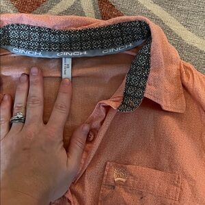 Cinch shirt with teal and white stripes and peach. Classic button-up design. Ideal for versatile wear.