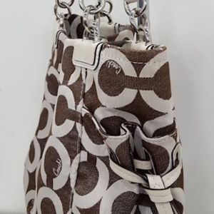 2 Coach bags . 1 shoulder, yellow stripe &1 peyton OP art satchel . Brown tones . EUC