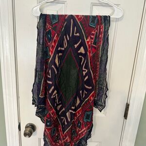 Vibrant scarf with geometric patterns. Features shades of purple, red, and green.