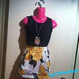 It's sleeveless back top combined with printed yellow black in white bottom dress. Two pockets and very comfortable to use casual or chick party. Materials are cotton and polyester. Easy to match with any kinds of shoes because of the top color is black.