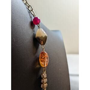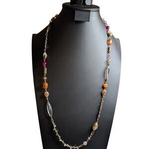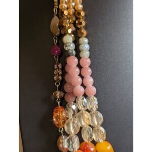 Two Coordinating Loft Beaded Orange Pink Yellow Gold Tone Beaded Long Necklaces. Metallic beads, crystals, bezel set glass beads. Wear together or separately. Pre-owned, these necklaces are in excellent condition.