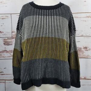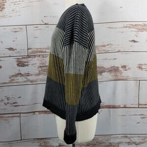 Two Danes 100% merino wool crew neck pullover sweater. Horizonal stripes in shades of grey and mustard yellow with dark grey or black vertical stripes. Very good preowned condition, Size: Large.