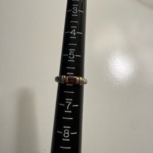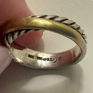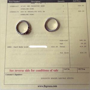 One is the classic David Yurman twist / crossover band and the other features a center rhodolite stone.