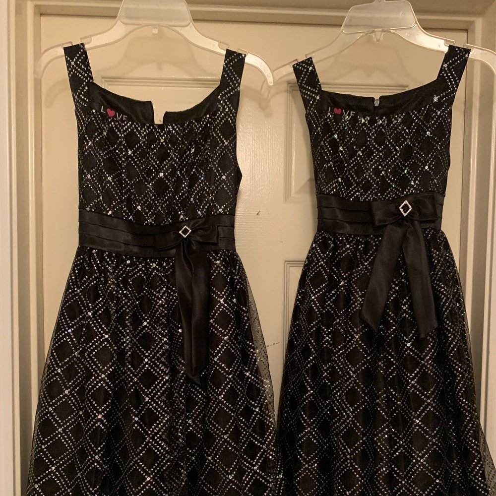 Black dress with sparkles.Trimmed at the waist and hem with satin ribbon. Great father daughter dance dress or any memorable occasion. Zipper is broken in the 16 and is only $28. Size 10 has no issues and is $40. Slightly worn.