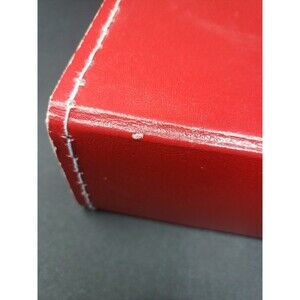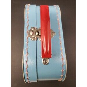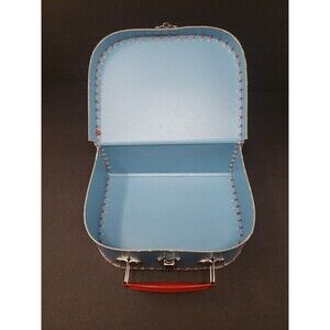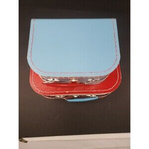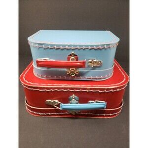Made from fiberboard and metal materials, these suitcases are durable and will withstand wear and tear. The single compartment makes them easy to organize and the suitcases are ideal for those who like to keep their items in style. Whether you're looking for a storage solution for your doll clothes or a stylish way to transport your toys, these mini suitcases are the perfect choice. Gently used. Very light wear. See photos. Small 8x6x3: Blue with red stitching and red metal handle. Medium 10x7x3.25. Red with blue stitching and blue metal handle. Fiberboard with cotton stitching. Set of 2. See photos.