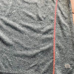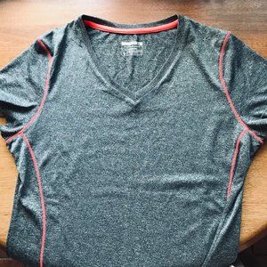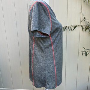 Layer 8 grey v-neck top, short sleeves, 28" long; seams