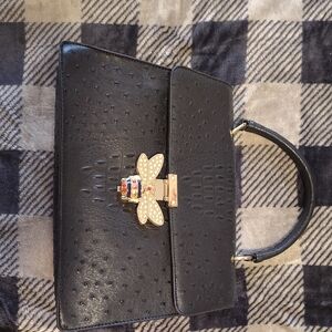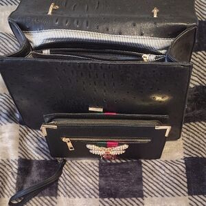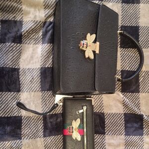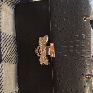 Chic black clutch with a striking gold bee embellishment. Perfect for elevating any ensemble. Also has long shoulder strap also comes with Wallet it's never been used NEW with the Pink bag to be purchased together as a set