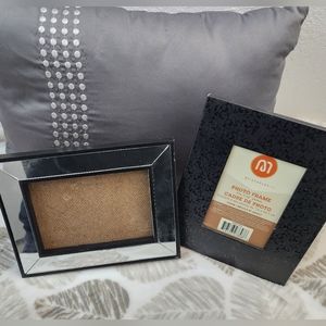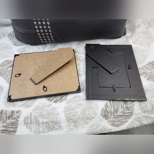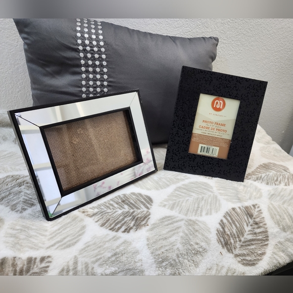 Two lightly used picture frames. One has a mirror as part of the frame, the other is just black with a little black leaf/flowery design.
