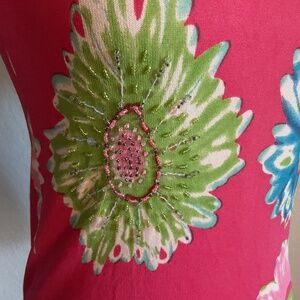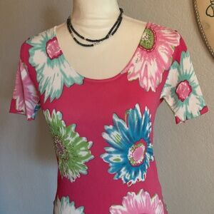 Two for the price of one! These fun and feminine scoop neck short-sleeve tops are made of rayon and nylon in pretty pink patterns. Both colorful tops are embellished with beads and as such, hand washing in cold water is recommended. Labeled petite small by manufacturer.