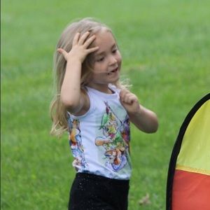 Disney-themed romper is pull on with sparkly black short bottoms. Very soft material.