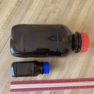 Two bottles amber glass square with screw-on cap.