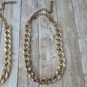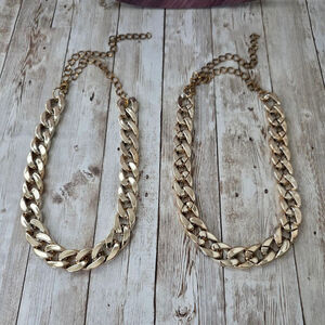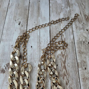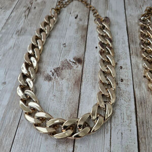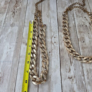 This is a pre-owned, gold-colored chain necklace. It features large, interlocking links, creating a bold, chunky appearance. The metal material shows some minor scratches and wear, consistent with previous use.. No brand is visible.