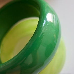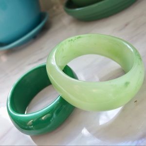 -Both have an organic shape; lighter green bangle has a milky translucence with marbling effect. I think these are made of resin but not certain