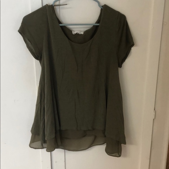 Cloud Chaser short sleeve top with sheer underlining is a medium and has a small run in front. An American Eagle soft and sexy quarter length sleeved top is a small. Both green and flows nicely at bottom.