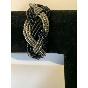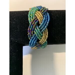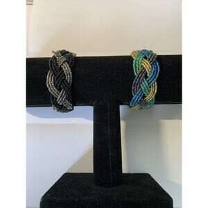 Two Hand Crafted Seed Beaded Bracelet 8’ Black/Silver Blues/Gold Woven