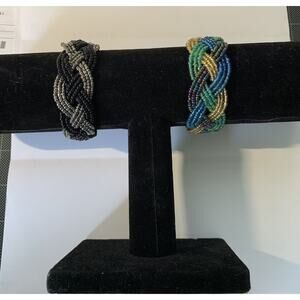 Two well made bracelets. One is silver/ black, the other is blue/gold/purple, etc.