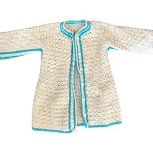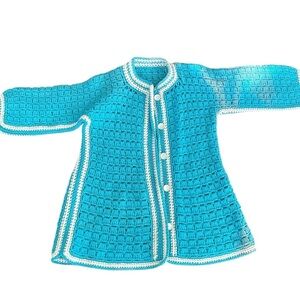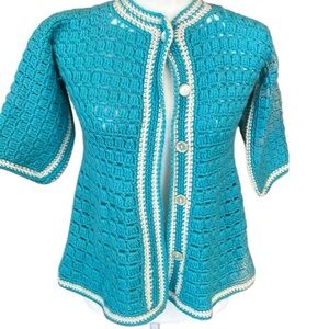 Two Hand Knit Cardigan Sweaters Size XS Adorable Five button matching sweaters, half sleeved. There are a few pulls in the stitching and a bit of discoloration on the sleeve and bottom of the aqua sweater. Comfy, warm & unique, could be worn by a young girl or petite gal.