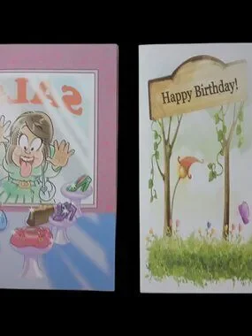 Two handmade birthday cards. One teenager and one child. These cards are hand-done. 80% of our cards are hand-made. These cards are whimsical. They come from a non-smoking home.