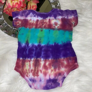 Two handmade tie-dyed short sleeve onesies. One features yellow, orange, and pink and the other is teal, purple, plum. Both were dyed on new white 100% cotton onesies. Both are size 18M. In excellent condition