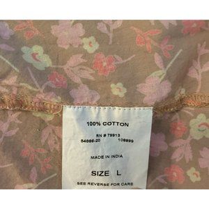 Button front, brown/pink floral 3/4 sleeve shirt. Cute ties on side of sleeves.