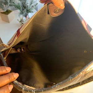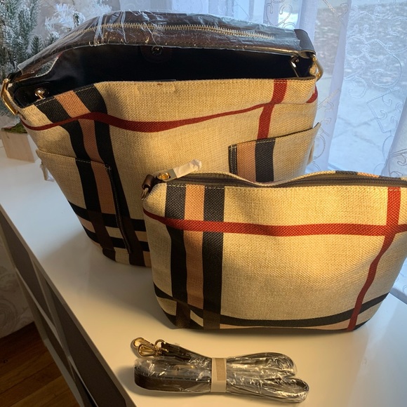 Burberry like style pattern, very roomy two in one bag. Options galore and second bag can be used as a makeup bag! Many options with this purse