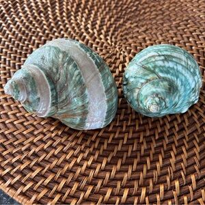Enhance your home with this elegant green seashell art decor. Perfect for adding a touch of nature to any room. Set of 2. These are polished. Small one 3” wide by 3” length and big one 4” wide by 4” length. No cracks.