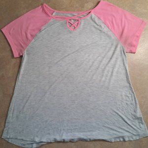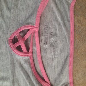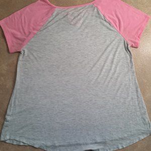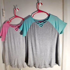 The second top is gray with pink sleeves.