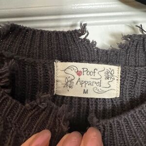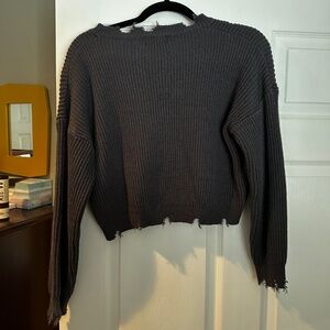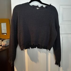 Two Knit Sweaters: One slate gray sweater with fraying designed neck line and hem, size M. One light blue off the shoulder sweater, size M.
