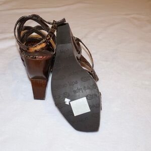 Statement platform heels with a gorgeous multi-tone metallic pattern and chunky wood heel. Super unique, comfy for a heel, and perfect for nights out, festivals, or dressing up a simple outfit.